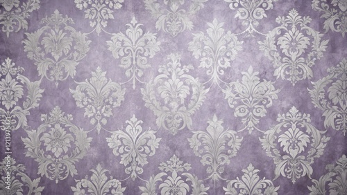 Distressed vintage wallpaper with a subtle violet hue and intricate silver patterns, wallpaper, luxury