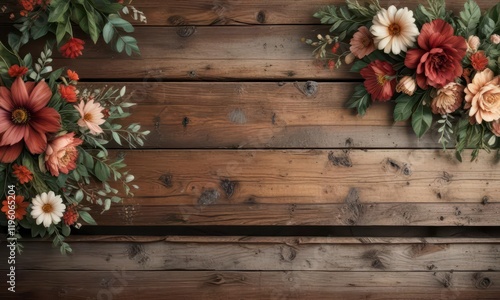 Distressed wood grunge banner with floral patterns and earthy tones, bohemian, outdoor decor, wooden banners