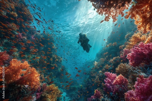 underwater, ocean, aqualung, diver, coral, reef, fish, marin, life, adventure, travel, aquatic, environment, turquoise, tropical, explore, swimming, wetsuit, mask, fin, diving, recreation, activity, tour tourism, vacation, nature, seascape, sunlight, colourful, formation, animal, oxygen, tank, snorkel