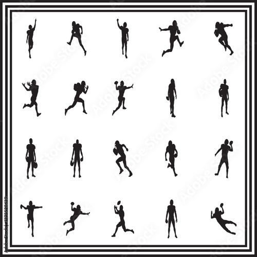 american football, silhouette, sport, athlete, action, dynamic, running, jumping, catching, throwing, football, player, team, competition, athletic, active, black-and-white, monochrome, graphic design, illustration, vector, logo design, educational