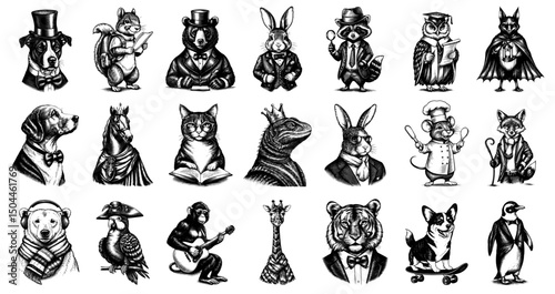 Diverse Anthropomorphic Animals in Varied Attire in a black and white vintage woodcut engraved ink style. Hand drawn illustration.