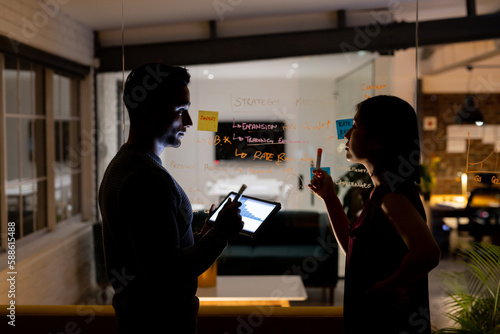 Diverse business people using tablet, making notes on glass wall, brainstorming late at office
