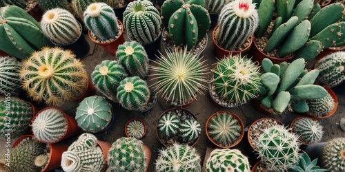 Diverse Collection of Cacti in Pots Captured From Above Showcasing Unique Shapes and Textures in a Vibrant Green Setting