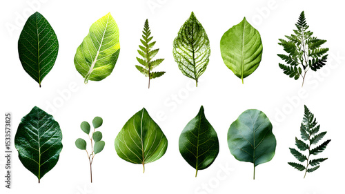 Diverse collection of fresh green leaves isolated on a black background illustrating various shapes textures and botanical varieties for design and education