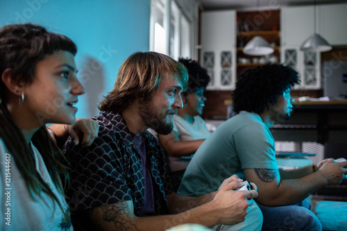 people, diverse, friends, gaming, relaxing, home, man, woman, young, adult, caucasian, african, american, happy, emotion, interaction, bonding, togetherness, indoor, casual attire, daytime, technology, fun, entertainment, activity, leisure, modern, connection, friendship, youth, adult, inclusion, equity, diversity, relaxation, teamwork, joy, smiling, digital, collaboration, recreation, positive, play, social, black, white, male, female, lifestyle