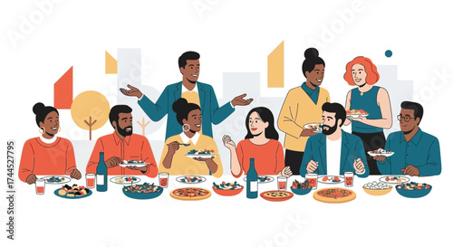 dinner, people, friends, eating, eatery, food, together, meal, gathering, enjoy, diverse, cheerful, smiling, friendship, sharing, celebration, social, group, lifestyle, happy, community, feast, colourful, illustrated, graphic, illustration, modern, vector, oneness, relationship, communication, conversation, connection, table, plate, dish, pizza, salad, drink, casual attire
