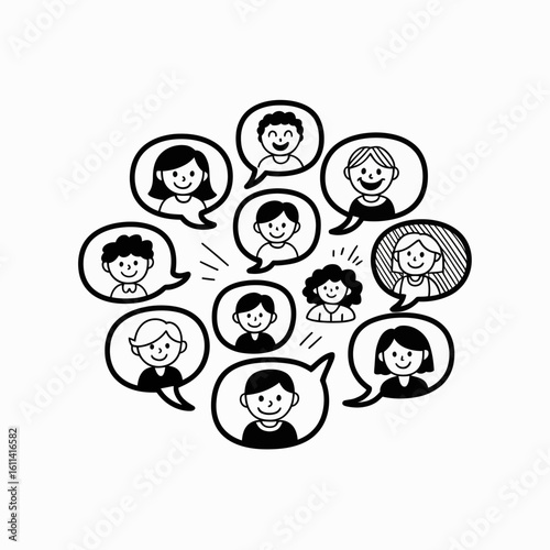 children, children, boy, girl, communication, social, interaction, online, network, community, group, team, speech, bubble, dialogue, conversation, chat, discussion, connection, friendship, collaboration, diversity, multicultural, inclusion, togetherness, oneness, support, sharing, idea, thought, feeling, emotion, expression, illustration, graphic, design, vector, cartoon, doodle, vignetting, simple, cute, happy, smiling, black, white, monochrome