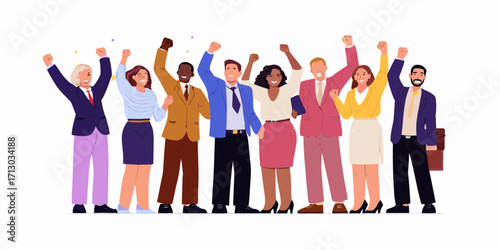 business, team, success, celebration, group, people, diversity, oneness, achievement, victory, happiness, joy, excitement, professional, colleague, work, office, meeting, collaboration, together, winning, confetti, party, event, corporate, startup, company, employee, man, woman, caucasian, african american, asian, multicultural, illustration, vector, modern, background, white background, isolated, positive, optimism