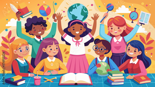 girl, diverse, school, children, celebrate, education, happy, group, classmate, student, joy, learning, studying, book, globe, classroom, multicultural, friendship, youth, cheerful, oneness, children, play, fun, smiling, enthusiasm, elementary, primary, cognition, discovery, academic, schoolwork, friends, playful, colourful, illustration, cartoon, drawing, character, animated, inclusive, teamwork, creativity, engagement, participation, culture, vector