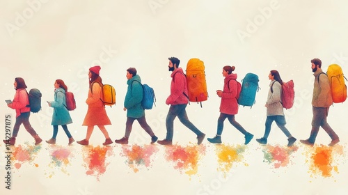 Diverse Group of Hikers with Backpacks Walking Together on a Colorful Abstract Background Representing Adventure, Exploration, and Connection with Nature