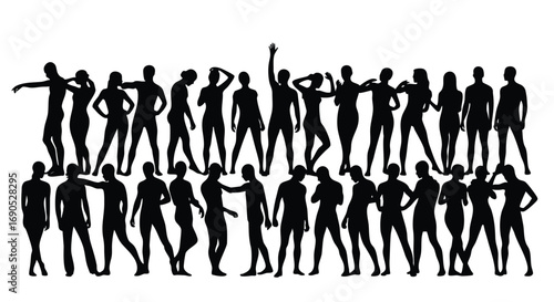 people, silhouette, group, diverse, crowd, black, white, background, pose, standing, figure, human, man, woman, person, together, teamwork, community, social, gathering, connection, oneness, cooperation, support, communication, interaction, activity, lifestyle, body, shape, outline, pattern, design, element, template, texture, anonymous, faceless, illustration, vector