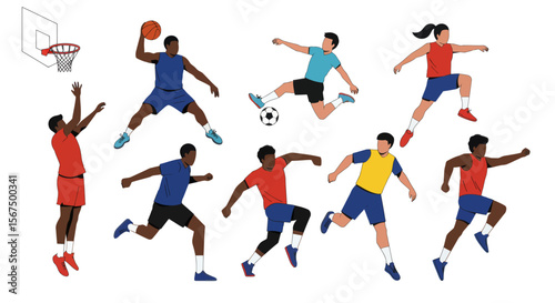 Diverse group of people playing basketball and soccer, in dynamic action poses.