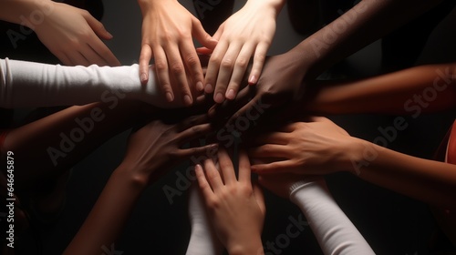 Diverse hands joined together forming a circle, Group of people Shaking hands, Top view.