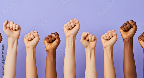 hand, raised, oneness, protest, justice, equality, right, demonstration, concept, diverse, skin, tone, fist, empowerment, support, togetherness, solidarity, movement, people, group, community, strength, power, resistance, activism, social, change, background, purple, arm, human, fight, voice, hope, freedom, culture, racial, ethnic, multicultural, inclusion, tolerance, peace, harmony
