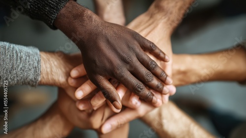 Diverse hands stacked together in unity gesture, teamwork and inclusion concept, top view