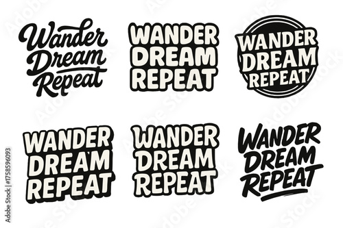 Diverse Lettering Styles. Wander dream repeat. Set lettering. harmonious lettering variations of the same emblematic concept (Bold hand-lettering with playful