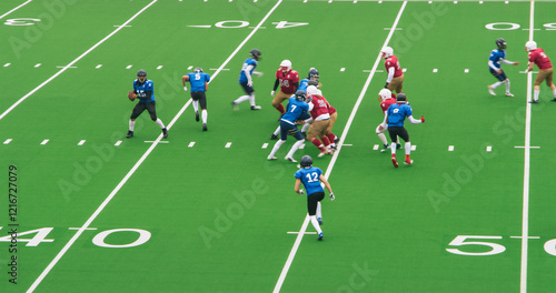 Diverse Male Athletes in Red and Blue Jerseys Compete in an American Football Game. Motivated Players Clash for Control on the Field, Dodging and Blocking Opponents