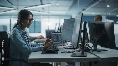 Diverse Office: Indian IT Programmer Working on Desktop Computer. Female Specialist Creating Innovative Software Engineer Developing App, Program, Video Game. Terminal with Coding Language.