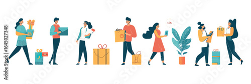 Diverse people carrying shopping bags and gift boxes with reward icons in flat minimalist vector style for loyalty and cashback marketing program illustration