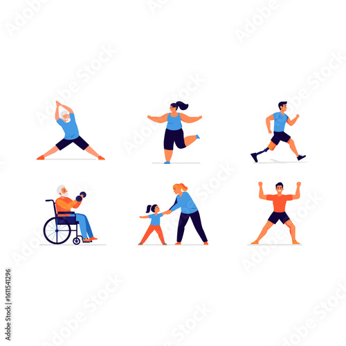 fitness, exercise, health, lifestyle, wellness, people, activity, sport, physical exercise, training, active, healthy, diversity, inclusion, senior, elderly, children, children, disabled, wheelchair, running, stretching, weightlift, yoga, adult, young, old, group, different, variety, movement, energy, strength, balance, coordination, physical therapy, rehabilitation, community, together