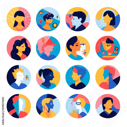 diverse, people, profile, illustration, circle, art, style, variety, abstract, graphic, design, avatar, portrait, icon, collection, set, creative, modern, human, face, colourful, concept, different, ethnicity, sex, identity, culture, community, network, social, media, communication, connection, user, interface, design element, vector, minimalist, business, team, member, representation