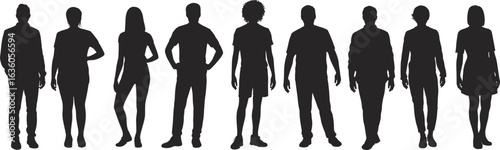 Diverse people silhouette standing together, human group illustration, community crowd, gender diversity concept, teamwork unity, black profile characters, vector art