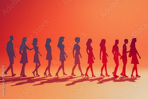 paper, people, figure, colourful, vibrant, bright, cheerful, optimistic, positive, uplifting, hopeful, playful, fun, group, community, silhouette, walking, procession, line, row, sequence, progression, movement, journey, stride, forward, advance, step, path, direction, destination, future, progress, ambition, determination, collaboration, companionship, oneness, togetherness, teamwork, support, diversity, inclusion, orange, background, shadow, design