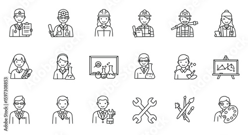 profession, career, job, occupation, people, doctor, engineer, firefighter, teacher, artist, science, medicine, construction, education, artwork, industry, labor, vocation, employment, manpower, service, skill, trade, line, drawing, vector, outline, pictogram, profession, shopkeeper, expert, specialist, artisan, adviser, instructor, scholar, technician, plumber, craftsman, professional, men at work, personnel, manpower