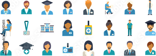 Diverse set of medical icons depicting doctors, nurses, graduates, hospital building, and identification badges, symbolizing healthcare services