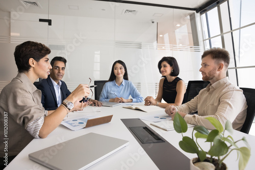 Diverse team of colleagues meeting for corporate discussion, brainstorming on work project. Business partners, stakeholders, board of directors talking at large office table, discussing teamwork