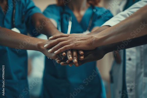 Diverse team of healthcare workers joining hands in solidarity and teamwork in a hospital setting.