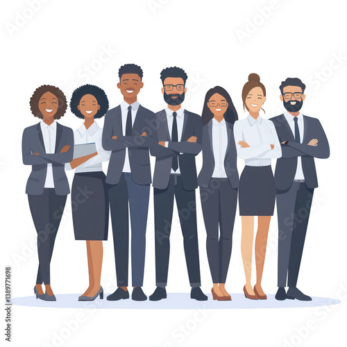 Diverse team of professionals standing confidently together in business attire, showcasing unity and teamwork against a white background.