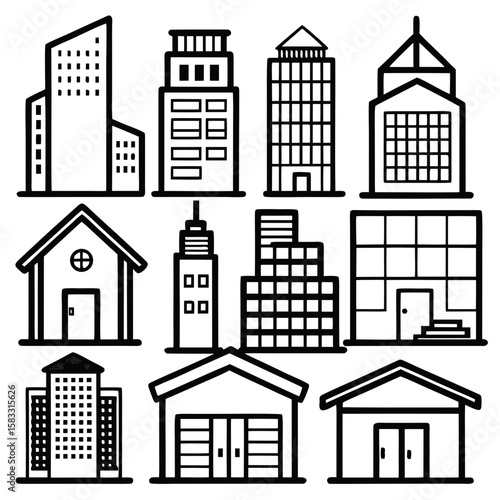 city skyline, graphic design, black-and-white, simple icons, window, door, rooftop, construction, architecture, city life, housing, business, residential, commercial, graphic elements