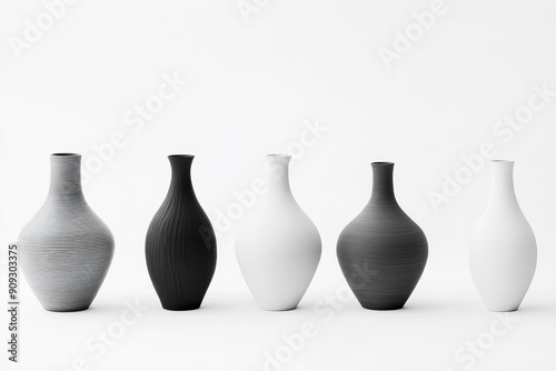 Diverse vase elegance. Materials blend harmoniously. Shapes vary gracefully. White backdrop highlights contours. Soft light reveals textures. Misty aura adds intrigue.