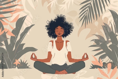 woman, meditation, asana, lotus, tropical, summer, palm, diverse, mindfulness, yoga, teacher, breathing, nubes, love, secure, black, copy space, flat, illustration, female, femininity, girl, lifestyle, young, person, position, relax, background, physical, peaceful, flexibility, training, beauty, balance, sport, energy, concentration, beautiful, gymnastics, meditating, well-being, figure, care, caucasian, practice
