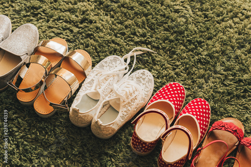 carpet, casual attire, children, childhood, choice, clothing, collection, colourful, design, different, diversity, fashion, foot, female, footwear, girl, gold, green, nubes, industry, children, lace, little, many, nobody, object, online, pair, red, sale, sandal, set, shoe, shopping, small, spring, store, style, stylish, summer, topview, trendy, white, young, row
