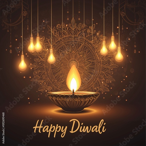 Diwali background with text Happy Diwali Instagram post design template, flat illustration of a beautiful oil lamp with hanging light bulbs