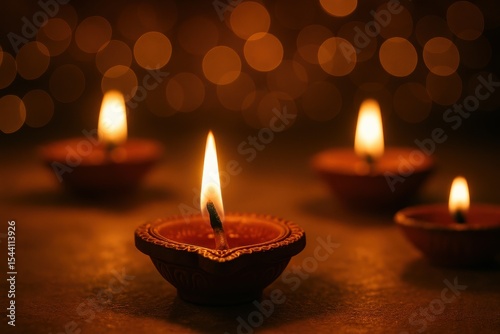 Diwali celebration with flickering oil lamps and golden bokeh lighting effects