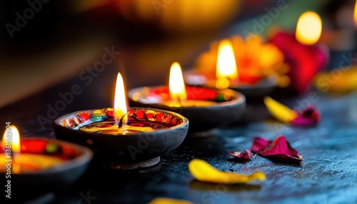 Diwali Celebrations with Lit Clay Diyas and Flower Petals on a Festive Surface