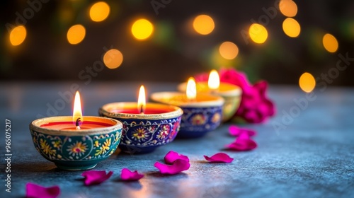 Diwali diya oil lamps with flowers holiday background. Creating a festive and decorative composition.