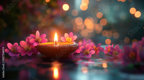 Diwali festival celebration featuring vibrant diya oil lamps and floral mandalas with bokeh