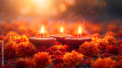 Diwali oil lamps with marigolds