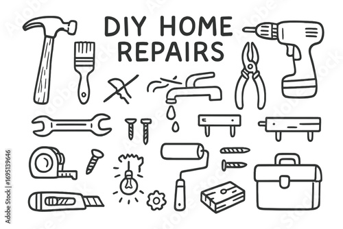 DIY Home Repair Icons. DIY home repairs doodle set: hand drawn icons for tools, minor fixes, and weekend projects, isolated