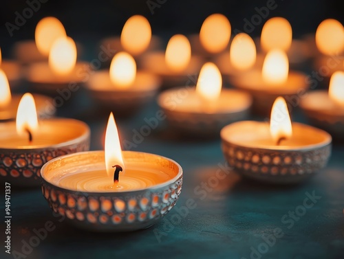 Diyas arranged in intricate mandala patterns, glowing with soft light during a religious ceremony, Festivity, Diyas, Belief