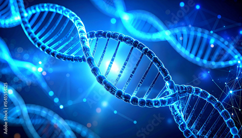 DNA Strand in Blue Hues: A vibrant visual representation of DNA structure, with twisting double helix strands bathed in an ethereal blue glow, symbolizing the building blocks of life.