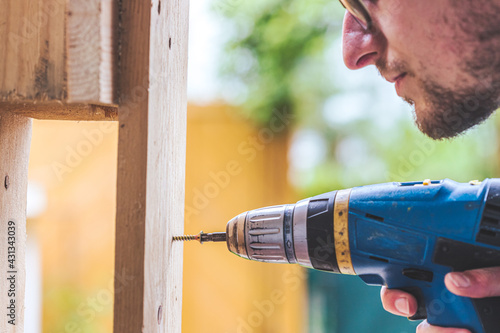 Do it yourself: Home Handyman is using a cordless screwdriver for screwing