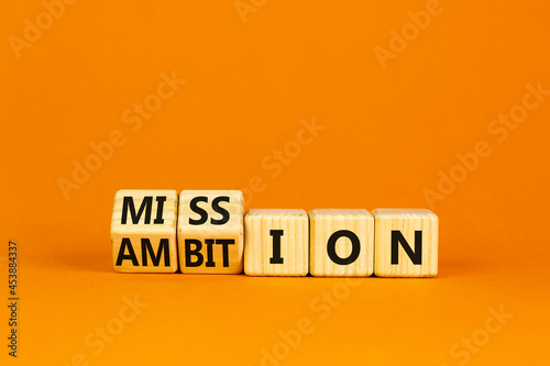 Do your mission with ambition. Turned wooden cubes and changed the word mission to ambition. Beautiful orange table, orange background, copy space. Business, mission or ambition concept.