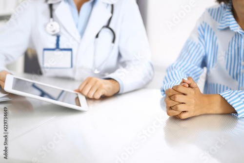Doctor and patient talking and discussing health treatment while sitting at the desk. Physician pointing into tablet pc, close-up. Medicine and health care concept
