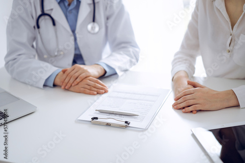 Doctor and patient discussing current health questions while sitting near of each other and using clipboard at the table in clinic, just hands closeup. Medicine concept