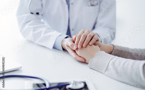 Doctor and patient sitting at the table in clinic office. The focus is on female physician's hands reassuring woman, only hands close up. Medicine concept